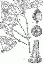 | Le bois de cœur est blanc jaunâtre à brun-jaune, parfois avec une figure rubanée ou moirée, et il est peu distinct de l’aubier qui a jusqu’à 5 cm de large. Le fil est généralement droit, le grain fin à moyennement fin. Le bois est mi-lourd, avec une densité de 685–730 kg/m³ à 12% d’humidité. Avec un peu de soin, il sèche bien à l’air avec peu de dégradation, mais il doit être scié sur quartier et séché lentement. A 12% d’humidité, le module de rupture est de 133–150 N/mm², le module d’élasticité de 15 790 N/mm², la compression axiale de 55–70 N/mm², le fendage de 15,7–20,6 N/mm et la dureté Chalais-Meudon de 3,6–4,2. Le bois est cassant et assez peu résistant aux chocs. Il est assez facile à scier, se travaille bien aux outils à main et à la machine, et il peut être raboté en donnant un fini lisse. Il ne se fend pas aisément au clouage, et présente une bonne tenue des clous et des vis. Il est seulement moyennement durable, et sujet aux attaques de bleuissement, de termites et de térébrants marins. L’aubier est assez perméable aux produits d’imprégnation, tandis que le bois de cœur est rebelle. Le fruit frais contient par 100 g : eau 71 g, énergie 376 kJ (90 kcal), protéines 1,4 g, lipides 6,6 g, glucides 6,2 g, Ca 17 mg, P 14 mg. | |||