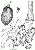 | Arbre sempervirent de taille moyenne à assez grand, atteignant 35 m de haut ; fût cylindrique, atteignant 100–150 cm de diamètre, parfois avec de petits contreforts ou des racines échasses ; écorce rugueuse et écaillée, écorce interne rouge-brun à brune, finement fissurée, exsudant une sève jaune vif ; rameaux anguleux ou côtelés, brun foncé à noirs. Feuilles opposées, en touffes denses terminales, simples et entières ; stipules absentes ; pétiole jusqu’à 2,5 cm de long, trapu ; limbe obovale à oblong-oblancéolé, de 9–25 cm × 3,5–7 cm, base cunéiforme, apex courtement acuminé, coriace, glabre, vert foncé brillant sur le dessus, pennatinervé à nombreuses nervures latérales parallèles, terminées par une nervure marginale, à canaux glandulaires parallèles aux nervures. Inflorescence : thyrse terminal, à 1–7 fleurs. Fleurs bisexuées, régulières, 5-mères, jaunâtres ou blanc verdâtre ; pédicelle de 1–4 cm de long, souvent arqué ; sépales libres, ovales, atteignant 5 cm de long, très inégaux, coriaces ; pétales libres, oblongs à ovales, atteignant 6 cm de long, carénés ; étamines nombreuses, disposées en 5 faisceaux opposés aux pétales, de 4–6,5 cm de long, fusionnées à la base ; glandes du disque 5, alternant avec les pétales, atteignant 0,5 cm de haut ; ovaire supère, ovoïde-ellipsoïde, de 1–2 cm de long, 5-loculaire, style allongé, terminé par 5 lobes linéaires étalés atteignant 0,5 cm de long. Fruit : baie ellipsoïde à ovoïde, de 9–15 cm × 6,5–12,5 cm, base entourée du calice, des étamines et des glandes du disque persistants, apex pointu, paroi grossière, brune, coriace, à 5–15 graines. Graines pyramidales, à côtés aplatis ou irrégulières, de 3–4 cm × 2,5–3 cm, brun foncé. Plantule à germination hypogée ; épicotyle rougeâtre, de 10–30 cm de long ; premières feuilles opposées, de 7–16 cm × 2,5–4,5 cm. | |||