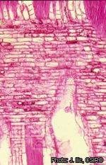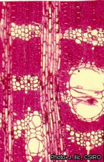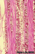 | Description anatomique du bois (codes IAWA pour les bois feuillus) : Cernes de croissance : 2 : limites de cernes indistinctes ou absentes. Vaisseaux : 5 : bois à pores disséminés ; 13 : perforations simples ; 22 : ponctuations intervasculaires en quinconce ; 25 : ponctuations intervasculaires fines (4–7 μm) ; 31 : ponctuations radiovasculaires avec des aréoles très réduites à apparemment simples : ponctuations rondes ou anguleuses ; 32 : ponctuations radiovasculaires avec des aréoles très réduites à apparemment simples : ponctuations horizontales (scalariformes) à verticales (en balafres) ; 42 : diamètre tangentiel moyen du lumen des vaisseaux 100–200 μm ; 43 : diamètre tangentiel moyen du lumen des vaisseaux ≥ 200 μm ; 46 : ≤ 5 vaisseaux par millimètre carré ; (47 : 5–20 vaisseaux par millimètre carré) ; 56 : thylles fréquents. Trachéides et fibres : 61 : fibres avec des ponctuations simples ou finement (étroitement) aréolées ; 66 : présence de fibres non cloisonnées ; 70 : fibres à parois très épaisses. Parenchyme axial : 85 : parenchyme axial en bandes larges de plus de trois cellules ; 86 : parenchyme axial en lignes minces, au maximum larges de trois cellules ; (87 : parenchyme axial en réseau) ; 93 : huit (5–8) cellules par file verticale ; (94 : plus de huit cellules par file verticale). Rayons : (97 : rayons 1–3-sériés (larges de 1–3 cellules)) ; (98 : rayons couramment 4–10-sériés) ; (102 : hauteur des rayons > 1 mm) ; 104 : rayons composés uniquement de cellules couchées ; (106 : rayons composés de cellules couchées avec une rangée terminale de cellules dressées et/ou carrées) ; 115 : 4–12 rayons par mm. Inclusions minérales : 136 : présence de cristaux prismatiques ; 138 : cristaux prismatiques dans les cellules couchées des rayons ; 141 : cristaux prismatiques dans les cellules non cloisonnées du parenchyme axial ; 142 : cristaux prismatiques dans les cellules cloisonnées du parenchyme axial ; 154 : plus d’un cristal approximativement de même taille par cellule ou par loge (dans les cellules cloisonnées). (E. Ebanyenle, A.A. Oteng-Amoako & P. Baas) | |||