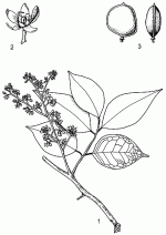 | Evergreen medium-sized to fairly large tree up to 35(–65) m tall; bole branchless for up to 15(–30) m, straight or crooked, angular, up to 90(–120) cm in diameter, with small to fairly large buttresses up to 2 m high; bark surface scaly with small, irregular scales, greyish with yellowish brown patches, inner bark thin, brittle, yellowish outside, reddish inside, with a reddish, sticky exudate; crown rounded, dense; twigs with scattered lenticels, soon glabrous. Leaves alternate, imparipinnately compound with (3–)5 leaflets; stipules 2–3 mm long, caducous; petiole 1–3 cm long, rachis 3–5 cm long; petiolules c. 0.5 cm long; leaflets alternate, sometimes nearly opposite, obovate to elliptical, 4–13(–16) cm × 2–6 cm, cuneate to rounded at base, acuminate at apex, margins recurved, thick-papery, glabrous, pinnately veined with 4–9 pairs of lateral veins. Inflorescence a terminal or axillary panicle up to 15 cm long, short-hairy. Flowers bisexual, zygomorphic, fragrant; pedicel 2–3 mm long; sepals 5, free, triangular to broadly elliptical, c. 2.5 mm long, hairy; petal 1, spatulate, c. 2.5 mm long, pale yellow; disk c. 1.5 mm in diameter, finely hairy; stamens 2; ovary superior, ovoid, sessile, hairy, 1-celled, style curved. Fruit a nearly globose, flattened pod 1.5–2 cm in diameter, glabrous, black, with spongy pulp, indehiscent, 1(–2)-seeded. Seeds rounded, flattened, c. 1 cm long, brown, finely veined. Seedling with epigeal germination; hypocotyl 4–6 cm long, epicotyl 2–3.5 cm long; cotyledons fleshy, elliptical, up to 1.5 cm long, greenish; first leaves opposite, simple. | |||