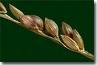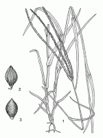 | Ascending, free-tillering annual grass up to 80 cm tall, with delicate kneed stems. Leaves alternate, simple; leaf sheath glabrous, smooth, striate; ligule membranous, broad, c. 2 mm long; blade linear to lanceolate, gradually tapering to an acute apex, 5–15 cm × 0.3–0.9 cm, glabrous. Inflorescence a terminal digitate panicle of 2–5 slender, spike-like primary branches up to 15 cm long. Spikelet up to 1 mm stalked, narrowly ellipsoid, 1.5–2 mm long, acute, glabrous, pale green, 2-flowered; lower glume hyaline, minute, upper glume broadly oblong, slightly shorter than spikelet, hyaline between the 3–5 green veins; lower floret sterile, upper floret bisexual; lemma about as long as spikelet, 7–9-veined; palea slightly shorter than lemma; stamens 3; ovary superior, with 2 stigmas. Fruit a caryopsis (grain), oblong to globose-ellipsoid, c. 0.5 mm long, white to pale brown or purplish. | |||