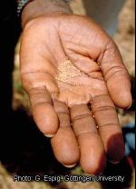 | Fonio seems not threatened by genetic erosion. RAPD-analysis has shown a relatively high level of genetic diversity in fonio compared to other millets, possibly due to its outbreeding nature. Most germplasm collections made before 1990 and kept in national genebanks have been lost, but duplicates exist at IRD (Institut de Recherche pour le Développement), Montpellier, France, which keeps more than 400 fonio accessions. Fonio accessions are also conserved in Senegal, Guinea, Mali, Burkina Faso, Togo, Benin and Nigeria. In Nigeria, Benin and Togo germplasm characterization work for a better understanding and utilization of the fonio gene pool has started. | |||