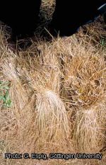 | Fonio is usually cut with a knife or sickle, tied into sheaves, dried and stored under cover. Mechanization is difficult because of lodging. When plants are dry, the grain shatters easily, and therefore it is better to harvest before the dry season has fully established and the relative air humidity has considerably declined. Harvesting is often staggered, to suit the immediate needs of the farmer. | |||
