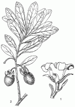 | Dioecious shrub or small tree up to 7 m tall, sometimes much smaller; bole sometimes spinescent towards the base; bark grey, more or less smooth. Leaves clustered at the ends of branches, simple and entire; petiole 3–15 mm long; blade obovate to oblanceolate, 1.5–8 cm × 0.5–3 cm, base cuneate, apex broadly tapering to rounded to acute, margin entire and tightly rolled under, papery to leathery, drying dull green or grey-green above, paler beneath, lower surface sparsely to densely silky hairy when young, hairs sometimes persistent, especially on the veins, midrib and lateral veins not prominently raised, secondary veins in 5–6 pairs. Flowers solitary in axils of leaves or reduced leaves towards base of current year’s growth, 8–15 mm in diameter, pendulous, creamy white, fragrant; pedicel slender, up to 3 cm long; calyx up to 8 mm long, deeply cleft into 5 lobes, densely silky hairy, lobes narrowly deltate or lanceolate-acuminate; corolla up to 1 cm. long, bell-shaped, widely open at the throat, densely strigulose outside, lobed to just below the middle, lobes 5, ovate-oblong, obtuse; male flower with 10 stamens 3–4.5 mm long, with glabrous filaments and narrowly lanceolate, apiculate, densely setose anthers, pistillode similar to functional pistil but with reduced styles and lacking stigmas; female flower with 10 densely setose staminodes 1–2 mm long, ovary subglobose, 2.5 mm × 2.5 mm, ridged, tomentellous, 6, 8 or 10-celled, styles (3–)5, common part puberulous, style-branches glabrous, ending in a shallowly bi-lobed stigma. Fruit an ovoid or globose berry up to 2 cm × 1.5 cm, apiculate, red, becoming black, downy hairy or glabrescent, persistent calyx accrescent, up to 1.5 cm long, lobes narrowly deltate and ultimately strongly reflexed, 1–6-seeded. Seeds up to 13 mm long, brown, smooth. | |||