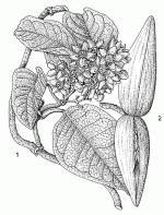 | Liana or climbing shrub up to 8(–20) m long; roots woody when old, aromatic; latex present. Leaves opposite, simple and entire; stipular ridges with fleshy teeth; petiole 2–7 cm long; blade ovate, broadly ovate, elliptical or sub-orbicular, (6–)12–20(–28) cm × (3–)6–14(–20) cm, base obtuse to cordate, apex acute. Inflorescence a lax axillary opposite panicle-like cyme, 10–20-flowered, glabrous to short-hairy; peduncle 2–4 cm long, pendulous. Flowers bisexual, regular, 5-merous, unpleasantly scented; pedicel 1–1.5 cm long; calyx with ovate to elliptical lobes, 2–3 mm × 1–2 mm, glabrous to short-hairy; corolla radiate, 2–3 cm in diameter, tube 2–3 mm long, lobes ovate, 9–11 mm × 4–6 mm, glabrous, inside yellow or with various hues of violet, red or purple and with a paler yellow triangular patch at base, outside pale green, margin somewhat recurved; corona lobes free, 6–8.5 mm long, fleshy, green-yellow or creamy yellow, 3-segmented at base, central lobule 5–7.5 mm long, spreading, tongue-like or horn-like, lateral lobules rounded, 1–2 mm long, fused at base to the central lobule; stamens with very short free filaments, anthers broadly flattened, bending over style head and partly fused to it; ovary semi-inferior, carpels 2, free, apically fused, terminally enlarged into broadly ovoid pentagonal style-head. Fruit consisting of a pair of obliquely ovoid, glabrous follicles, each one 8–12 cm × 2–4 cm, green, apex rounded, many-seeded. Seeds ovoid, 8–10 mm long, dark brown, at apex bearing a coma of hairs 2–2.5 cm long. | |||