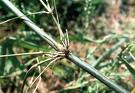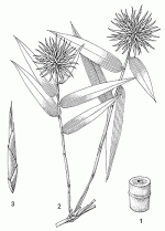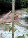 Clump-forming bamboo with a robust rhizome up to 10 cm in diameter; clump dense, typically consisting of 20–100 stems; stems (culms) erect, ascending or leaning outwards, 5–10(–15) m tall and 3–8(–10) cm in diameter, internodes 15–30(–40) cm long, the basal ones solid, the distal ones thick-walled, glabrous at maturity; young shoots grey-green, densely silky hairy. Leaves alternate, simple; sheath up to 15 cm long, with 2–5 mm long bristles at top; ligule short, c. 0.5 mm long; blade linear-lanceolate to oblong, 5–20(–26) cm × 1–5 cm, base tapering into a short false petiole, apex long-acuminate and pungent, somewhat glaucous, with numerous longitudinal veins. Inflorescence a dense star-shaped cluster 4–9 cm in diameter, with 10–20 spikelets. Spikelets sessile, narrowly lanceolate, 1.5–4.5 cm long, pungent, 1–4-flowered with upper floret bisexual and lower florets male or sterile; lower glume 5–8 mm long, upper glume 8–10 mm long, lemma narrowly lanceolate, the lowest 12–20 mm long, the uppermost about as long as spikelet, tapering into a rigid spine up to 7 mm long, palea narrowly lanceolate, somewhat shorter than lemma; floret with 6 stamens, filaments united into a tube, and a glabrous ovary extending into a hollow style terminating in 3 stigmas. Fruit a spindle-shaped caryopsis (grain) 10–15 mm long. Seedling with a short mesocotyl and a loose coleoptile, the first leaves without lamina; primary root a pale taproot bearing short lateral roots. |