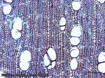 | Wood-anatomical description (IAWA hardwood codes): Growth rings: (1: growth ring boundaries distinct); (2: growth ring boundaries indistinct or absent). Vessels: (10: vessels in radial multiples of 4 or more common); 13: simple perforation plates; 22: intervessel pits alternate; (23: shape of alternate pits polygonal); 25: intervessel pits small (4–7 μm); 26: intervessel pits medium (7–10 μm); (30: vessel-ray pits with distinct borders; similar to intervessel pits in size and shape throughout the ray cell); (31: vessel-ray pits with much reduced borders to apparently simple: pits rounded or angular); 32: vessel-ray pits with much reduced borders to apparently simple: pits horizontal (scalariform, gash-like) to vertical (palisade); 33: vessel-ray pits of two distinct sizes or types in the same ray cell; (35: vessel-ray pits restricted to marginal rows); 41: mean tangential diameter of vessel lumina 50–100 μm; 42: mean tangential diameter of vessel lumina 100–200 μm; 47: 5–20 vessels per square millimetre. Tracheids and fibres: 61: fibres with simple to minutely bordered pits; 66: non-septate fibres present; 69: fibres thin- to thick-walled. Axial parenchyma: (77: axial parenchyma diffuse-in-aggregates); 86: axial parenchyma in narrow bands or lines up to three cells wide; (87: axial parenchyma reticulate); (89: axial parenchyma in marginal or in seemingly marginal bands); 92: four (3–4) cells per parenchyma strand; 93: eight (5–8) cells per parenchyma strand. Rays: 97: ray width 1–3 cells; (100: rays with multiseriate portion(s) as wide as uniseriate portions); (106: body ray cells procumbent with one row of upright and/or square marginal cells); 107: body ray cells procumbent with mostly 2–4 rows of upright and/or square marginal cells; 115: 4–12 rays per mm. Mineral inclusions: 159: silica bodies present; 160: silica bodies in ray cells; 161: silica bodies in axial parenchyma cells. (N.P. Mollel, P. Baas & A.A. Oteng-Amoako) | |||