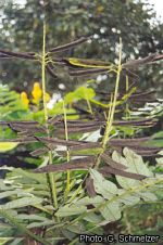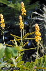 | Until the early 1980s, Cassia was considered a very large genus of about 550 species, but was then split into 3 genera: Cassia s.s. with about 30 species, Chamaecrista with about 250 species and Senna with about 270 species. Senna is very similar to Cassia, but is distinguished from it by the possession of 3 adaxial stamens which are short and straight, and the pedicels which have no bracteoles. Senna leandrii (Ghesq.) Du Puy is an endemic shrub or small tree of Madagascar, where the bark is chewed to relieve dental pain. | |||