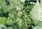 | Solanum aethiopicum is susceptible to several diseases and pest, although much less than eggplant. The most serious soil-borne diseases are wilt caused by Ralstonia solanacearum, collar rot and wilting caused by Sclerotium rolfsii and Verticillium dahliae, and root-knot nematodes (Meloidogyne spp.). These soil-borne diseases and pests can be controlled by crop rotation, e.g. with cereals or other starch crops or with amaranth, groundnut or onion, adequate drainage and a good soil structure. Root-knot nematodes are particularly problematic in areas where vegetables are grown year-round and unless crop rotation is taken seriously, production of African eggplant fruits, tomatoes and capsicums may not be economic. A serious disease, e.g. in Côte d’Ivoire, is Stemphylium floridanum; it causes small brown angular leaf spots causing a devastating defoliation. In Tanzania the chilli veinal mosaic virus (ChiVMV) spread by the green peach aphid (Myzus persicae) caused considerable damage. Spider mites (Hemitarsonemus and Tetranychus) are a serious problem in drier regions; acaricide sprays can control them. Other serious pests include grasshoppers (Zonocerus sp.), fruit and flower borers (Leucinodes and Scrobipalpa), leaf hopper (Jacobiasca lybica) and caterpillars (Selepa docilis). In Uganda the leaves of Shum Group are sometimes eaten by monkeys. | |||