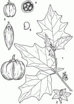 | Shrub to perennial or annual herb, up to 200 cm tall, often much-branched; root system extending both vertically and laterally; branches and leaves with or without prickles and stellate hairs. Leaves alternate, simple; stipules absent; petiole up to 11 cm long; blade broadly ovate, (6–)12–30 cm × (4–)7–21 cm, obtuse or cordate at base, acute to obtuse at apex, slightly to deeply lobed at margin, pinnately veined; upper leaves smaller, narrower, less lobed and often subopposite. Inflorescence a lateral, racemose cyme, up to 5(–12)-flowered; peduncle often short or even absent, rachis short to long. Flowers bisexual, regular, (4–)5–8(–10)-merous; pedicel (2–)4–12(–15) mm long, up to 27 mm long in fruit; calyx campanulate, lobes 4–10 mm long; corolla stellate, 6–15 mm long, white, sometimes pale purple; stamens inserted near the base of the corolla tube and alternate with corolla lobes, filaments short and thick, anthers connivent, yellow, opening by terminal pores; ovary superior, 2–6-celled, style as long as or slightly longer than stamens, stigma small, obtuse. Fruit a globose to depressed globose, ellipsoid, ovoid or fusiform berry 1–6 cm long, smooth to grooved, red or orange, usually many-seeded. Seeds lenticular to reniform, flattened, 2–5 mm in diameter, pale brown or yellow. Seedling with epigeal germination; cotyledons thin, leafy. | |||