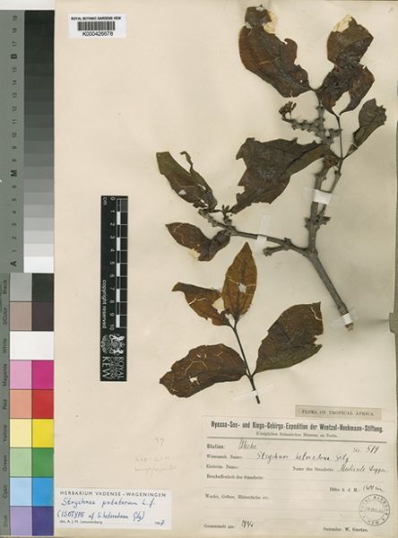 | • Bisset, N.G., 1970. The African species of Strychnos. Part I. The ethnobotany. Lloydia 33(2): 201–243. • Leeuwenberg, A.J.M., 1969. The Loganiaceae of Africa 8. Strychnos 3. Revision of the African species with notes on the extra-African. Mededelingen Landbouwhogeschool Wageningen 69–1. Wageningen, Netherlands. 316 pp. • Leeuwenberg, A.J.M. (Editor), 1980. Angiospermae: Ordnung Gentiales. Fam. Loganiaceae. Die natürlichen Pflanzenfamilien. Second Edition. Band 28 b-1. Duncker & Humblot, Berlin, Germany. 255 pp. • Massiot, G., Thepenier, P., Jacquier, M.-J., Le Men-Olivier, L. & Delaude, C., 1992. Alkaloids from roots of Strychnos potatorum. Phytochemistry 31(8): 2873–2876. • Neuwinger, H.D., 2000. African traditional medicine: a dictionary of plant use and applications. Medpharm Scientific, Stuttgart, Germany. 589 pp. | |||