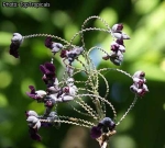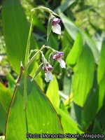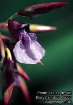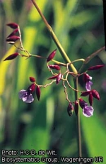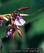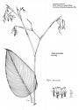 | Perennial, straggling herb up to 3.5 m tall, with short rhizome, tufts of leaves, and stems bearing an inflorescence and a single subtending leaf or sheath. Leaves imbricate; petiole sheathing at the base, basal sheath 20–40 cm long, uncalloused part of petiole 20–40 cm long, apical calloused part up to 2.5(–4) cm long, transition of the petiole into the midvein marked above by a depression at right angles to the midvein, green or occasionally red-purple, glabrous; blade subtriangular to ovate, rarely elliptical, oblong or sublinear, (12–)19–63 cm × (2–)4–26 cm, base rounded to subcordate, apex acute to acuminate, glabrous. Inflorescence a lax panicle up to 40 cm long; axis zig-zag, much branched, internodes 0.5–2 cm long; abaxial bracts 1–3.5 cm long, green or purplish, caducous, supporting a single cymule; cymule 2-flowered, backed by an adaxial bract, common peduncle absent. Flowers bisexual, zygomorphic, purple, sessile or on pedicel up to 2 mm long; bracteole absent, sepals 3, free, equal, ovate to elliptical, 0.5–2 mm long; corolla 6–13 mm long, with short tube and 3 lobes; staminodes and stamen in 2 cycles, at the base forming a tube fused to the corolla tube, outer cycle consisting of 1 petaloid staminode with clawed base, inner cycle consisting of 1 stamen and 2 staminodes, of which 1 hooded with 2 linear appendages; ovary inferior, 1-locular, style helically twisted, stigma appendaged. Fruit an ellipsoid to subglobose capsule up to 12 mm × 7 mm, indehiscent, orange-red, reticulate when dry, with persistent calyx, with membranous pericarp, 1-seeded. Seed ellipsoid to subglobose, 5–10 mm × 3–6 mm, smooth, brownish to greyish or black, with conspicuous to rudimentary aril. | |||