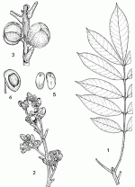 | Evergreen, dioecious, medium-sized tree up to 30(–40) m tall, variously hairy in all parts; bole cylindrical, up to 100(–200) cm in diameter, often slightly buttressed; bark 3–4 cm thick, outer bark pale grey to grey-brown, smooth, inner bark soft, cream-coloured, quickly turning pink to reddish brown; crown dense, spreading. Leaves alternate, imparipinnately compound with 2–5 pairs of leaflets; stipules absent; petiole and rachis up to 26 cm long; petiolules up to 1 cm long; leaflets opposite, obovate to oblanceolate, up to 21 cm × 8.5 cm, base rounded or cuneate, apex nearly always acute or acuminate, rarely rounded or notched, entire, pinnately veined with 8–14 pairs of lateral veins. Inflorescence an axillary or terminal panicle up to 11(–24) cm long, usually few-flowered. Flowers unisexual, male and female flowers very similar in appearance, regular, 5-merous, dirty white; pedicel up to 4(–10) mm long; calyx cup-shaped, 3.5–5.5(–7.5) mm × 5.5–9(–11) mm, usually lobed to halfway or more, lobes broadly ovate, 1–3 mm × 2–4 mm, hairy; petals free, linear, 13–22 mm long, hairy; stamens 10, 10–16 mm long, united into a tube in basal half, densely hairy inside; ovary superior, densely hairy, 3-celled, style 6–8.5 mm long, stigma head-shaped or disk-shaped; male flowers with rudimentary ovary, female flowers with non-dehiscing anthers. Fruit an obovoid to globose capsule c. 3 cm × 3 cm, slightly 3-lobed, without distinct stipe, dehiscent, up to 6-seeded. Seeds 18–25 mm × 9–15 mm, glossy black, almost completely concealed in a scarlet sarcotesta. Seedling with epigeal germination; hypocotyl up to 4 cm long, epicotyl 4–8 cm long; cotyledons sessile, fleshy; first leaves opposite and simple, subsequent leaves alternate and simple, becoming compound from c. 8th leaf. | |||