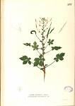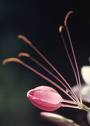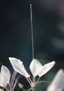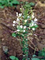 Erect annual herb up to 150 cm tall, strongly branched, with long taproot and few secondary roots; stem densely glandular. Leaves alternate, palmately compound with (3–)5(–7) leaflets; stipules absent; petiole 2–10 cm long, glandular; leaflets almost sessile, obovate to elliptical or lanceolate, 2–10 cm × 1–4 cm, cuneate at base, rounded to obtuse, acute or acuminate at apex, margins finely toothed, sparsely to distinctly hairy. Inflorescence a terminal raceme up to 30 cm long, bracteate. Flowers bisexual, white or tinged with purple; pedicel 1.5–2.5 cm long; sepals 4, free, ovate to lanceolate, up to 8 mm long; petals 4, elliptical to obovate, up to 1.5 cm long, clawed; androgynophore 1–1.5 cm long; stamens 6, purple; ovary superior, stalked, 2-celled. Fruit a long, narrow, cylindrical capsule up to 12 cm × 1 cm, stalked and beaked, usually green or yellow, dehiscing from below with 2 valves, many-seeded. Seeds subglobose, 1–1.5 mm in diameter, grey to black, irregularly ribbed. Seedling with oblong cotyledons; first leaves 3-foliolate. |