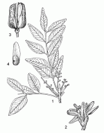 | Deciduous, monoecious or dioecious, medium-sized tree up to 28 m tall; bole straight, branchless for up to 9 m, up to 60(–120) cm in diameter; bark surface pale greyish to yellowish, rough; young twigs short-hairy. Leaves alternate, 12–20 cm long, paripinnately compound with up to 10 leaflets; stipules absent; petiole 3–4.5 cm long; petiolules 1.5–5 mm long; leaflets alternate or opposite, elliptical-oblong, 3–5(–8) cm × 1–1.5(–3) cm, base slightly asymmetrical, cuneate, apex slightly notched, margins slightly wavy, densely gland-dotted, hairy, pinnately veined with 12–18 pairs of lateral veins. Inflorescence an axillary panicle, short-hairy. Flowers unisexual or bisexual, regular, 5-merous, aromatic; pedicel 1–3 mm long; calyx with triangular lobes 4–5 mm long, thick, densely short-hairy; petals free, elliptical-oblong, 8–10 mm long, apex pointed and curled inwards, pink to yellowish, outside short-hairy; male flowers with 5 free stamens shorter than petals, disk lobed, c. 1 mm long, ovary rudimentary; female flowers with 5 rudimentary stamens, disk small, ovary superior, ovoid, 3–4 mm long, slightly 5-lobed, sparsely short-hairy, 5-celled, style c. 1 mm long, thick, stigma 5-lobed; bisexual flowers with slightly reduced stamens and ovary, and biologically non-functional. Fruit an ellipsoid capsule up to 3 cm long, dehiscing with 5 woody valves, short-hairy to glabrous, brownish to black at maturity, up to 12-seeded. Seeds ellipsoid, laterally flattened, c. 2 cm long, with a thin apical wing. | |||