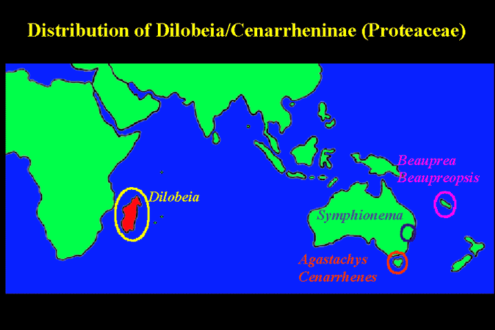 | Leaves of young plants of Dilobeia thouarsii are quite distinct from those of older trees; they have 2 or 4 narrow lobes up to 30(–50) cm long. Trees flower from October to March and fruits can be found nearly throughout the year, although they seem to ripen only in November to January. | |||