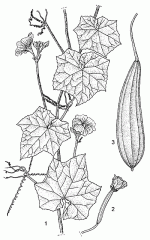 | Monoecious, annual, climbing or trailing herb, with acutely 5-angled stem; tendrils up to 6-fid, hairy. Leaves alternate, simple; stipules absent; petiole up to 15 cm long; blade broadly ovate to kidney-shaped in outline, 10–25 cm × 10–25 cm, shallowly palmately 5–7-lobed with broadly triangular to broadly rounded lobes, cordate at base, shallowly sinuate-dentate, pale green, scabrous, palmately veined. Male inflorescence racemose with 15–35 cm long peduncle. Flowers unisexual, regular, 5-merous, 5–9 cm in diameter; receptacle tube obconic below, expanded above, c. 0.5 cm long, lobes triangular, 1–1.5 cm long; petals free, pale yellow; male flowers with 3 free stamens inserted on the receptacle tube, connectives broad; female flowers solitary, on pedicels 2–15 cm long, with inferior, densely pubescent, longitudinally ridged ovary, stigma 3-lobed. Fruit a club-shaped, dry and fibrous capsule 15–50 cm × 5–10 cm, acutely 10-ribbed, brownish, dehiscent by an apical operculum, many-seeded. Seeds broadly elliptical in outline, compressed, up to 1.5 cm long, smooth, dull black. | |||