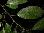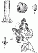| Medium-sized to large, glabrous tree up to 40 m tall; bole straight and cylindrical, unbranched for up to 20 m, 100(–150) cm in diameter, without buttresses but sometimes with heavy root swellings; bark grey to dark brown or black, 1–2 cm thick, finely fissured and peeling off in fine irregular scales; crown pyramidal, rather open, with few heavy branches; leaf-bearing branches laterally compressed. Leaves alternate, simple and entire, without stipules; petiole thin, 0.5–1 cm long, grooved above, decurrent into 2 fine ridges along the branch; blade elliptical, 4–12 cm × 2–5 cm, base rounded to cuneate, apex shortly acuminate, margins retrorse especially near the base, lateral veins 6–10 at each side of the midrib, joining at some distance from the margin. Inflorescence an axillary panicle, up to 15 cm long, consisting of densely flowered, umbel-shaped cymes. Flowers bisexual or functionally unisexual, regular, 4-merous, greenish; pedicel filiform, c. 6 mm long; calyx shallowly cup-shaped, c. 1 mm in diameter; petals strap-shaped, 3–4 mm long, recurved; disk 4 lobed; stamens united into a tube c. 3 mm long; ovary superior, sessile, 1-celled, style hardly exserted from the staminal tube. Fruit a globose drupe, 2–4 cm in diameter, enclosed by the enlarged calyx except for apical part, slightly acuminate, 1-seeded. Seed globose, c. 1.5 cm in diameter. Seedling with epigeal germination; hypocotyl very short, epicotyl c. 18 cm long; first pair of leaves opposite. | |||